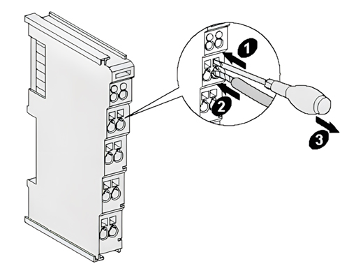 GCAN-PLC的电源模块及GC系列IO模块的接线方法如图2.5所示,先使用一字螺丝刀插入方形孔中,顶住方形孔中金属片的上沿,用力垂直向里压。之后将线缆插入圆形孔中。插好之后,拔出螺丝刀,线缆即可稳固地锁死在圆形孔中。