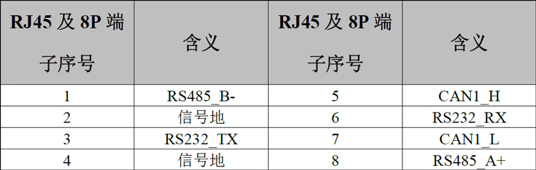 GCAN-PLC-511由总线通信模块与供电模块组成。总线通信模块上集成了一路以太网接口、一路RS232/485、CAN复用接口、一路CAN总线接口,其分别使用RJ45接口、RJ45接口、4P端子接口引出。RS232、RS485、CAN复用接口样式如图2.6所示,其接口定义如表2.1所示;CAN2总线接口样式如图2.7所示,其接口定义如表2.2所示。