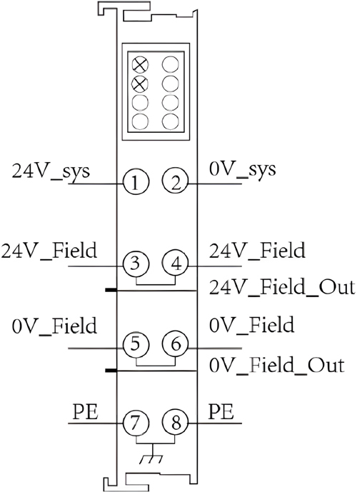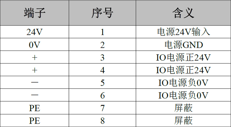GCAN-PLC的电源接线端子排如图2.8所示,其接口定义如表2.3所示。GCAN-PLC可编程逻辑控制器电源部分包含8个端子,需要注意的是:3号端子与4号端子之间、5号端子与6号端子之间、7号端子与8号端子之间,在模块的内部是相连的。