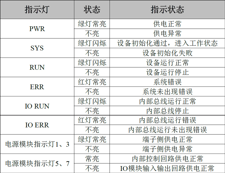 GCAN-PLC的正面突出区域包含6个圆形状态指示灯。指示灯的具体指示功能见表2.4。指示灯处于不同状态下时,GCAN-PLC的状态如表2.5所示。