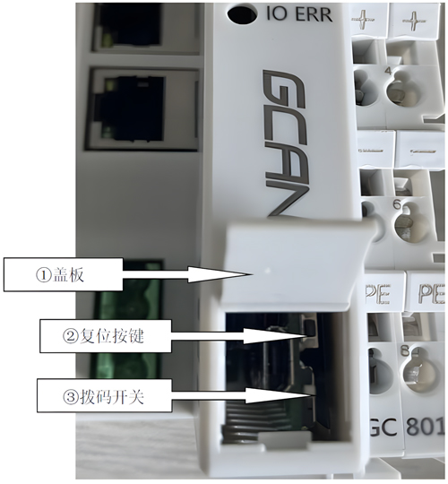 GCAN-PLC-511提供1个程序运行开关和1个复位按钮。打开盖板后实物图如图4.1所示。