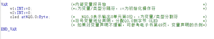 首先需要在变量区定义变量(VAR 到END_VAR)。
