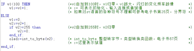 完成变量定义后便可在下方的编程界面开始编程了,下面为用ST 编写的简单例程语句: