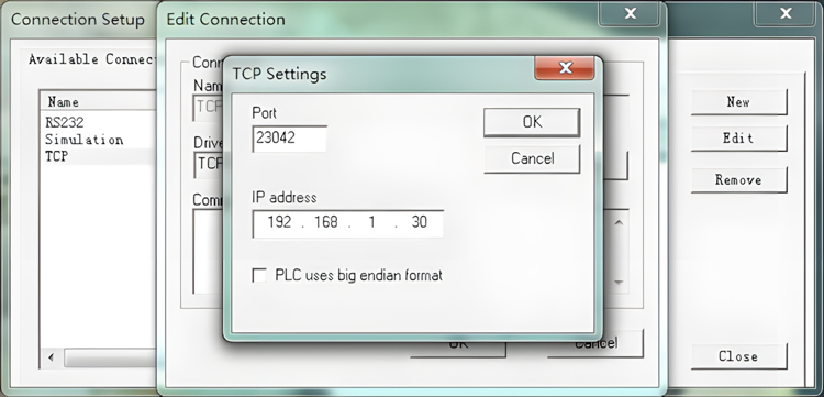 6、Port(端口)请输入23042。IP地址为192.168.1.30,设置好后点OK