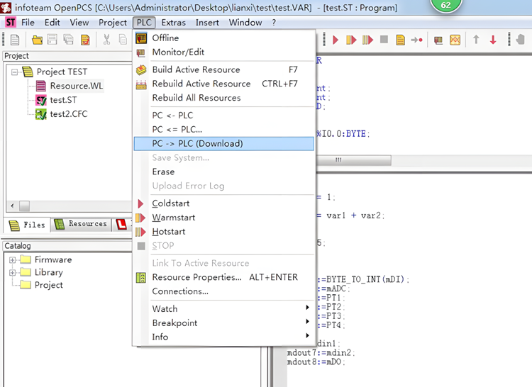 4、在下拉菜单中点击PC->PLC(Download)下载程序。
