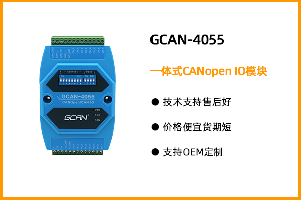 - GCAN-4055模块是集成1路标准CANopen接口、8路开关量输入通道、8路开关量输出通道的工业级CANopen数字量输入输出模块。采用GCAN-4055模块,用户可用于采集数字量输入信号,并输出数字量信号,控制开关,实现远程开关设备和CANopen网络之间的连接,构成CANopen网络中数据量信号采集、输出的控制节点。