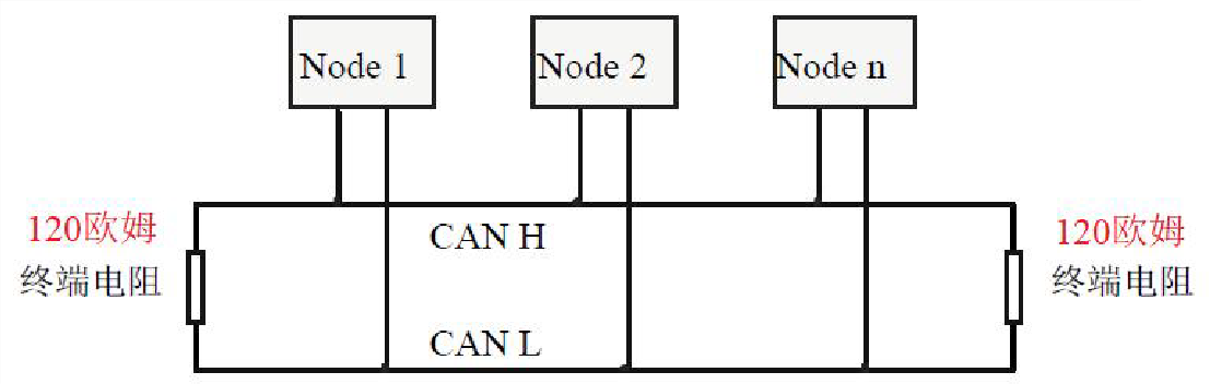 CAN-bus网络采用直线拓扑结构,总线最远的2个终端需要安装120Ω的终端电阻;如果节点数目大于2,中间节点不需要安装120Ω的终端电阻。对于分支连接,其长度不应超过3米。CAN-bus总线的连接如图所示。