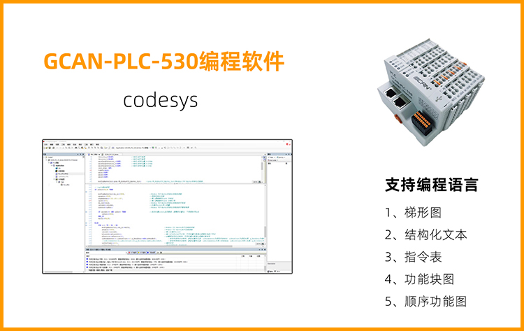 GCAN-PLC可使用CODESYS V3.5 SP16及以上版本软件对其编程。软件支持符合IEC-61131-3标准中规定的五种标准编程语言,这使得程序的可移植性和复用性很强,而且软件还具有多种调试功能(断点、单步等),调试程序更加方便。