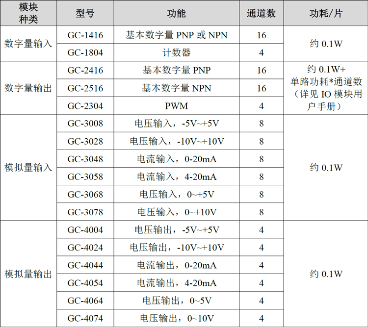 GC系列可编程控制器扩展模块目前包括:数字量输入扩展模块、数字量输出扩展模块,其他模拟量等扩展模块待更新。具体的选型表如下表所示。
