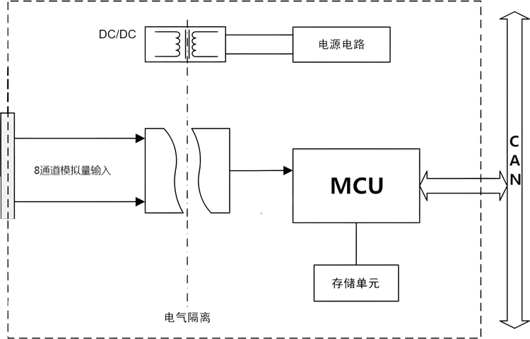 GCAN-4038模块包含8路模拟量隔离输入、电源电路、MCU最小系统、CAN通信电路等几部分,模块原理框图如图1.1所示。