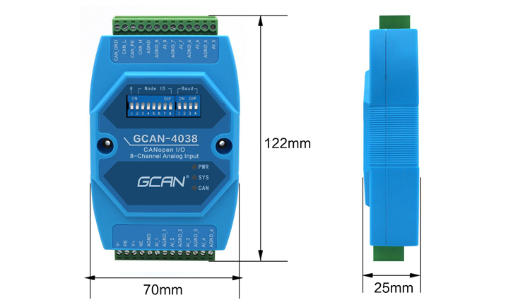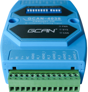 GCAN-4038模块是模拟量信号采集的关键性工具,同时该模块具有体积小巧、接线便捷等特点。GCAN-4038模块的总线接口集成隔离保护模块,使其避免由于瞬间的过压过流而对模块造成损坏。采用DIN导轨的固定方式,可使其更容易集成到各种控制柜中。