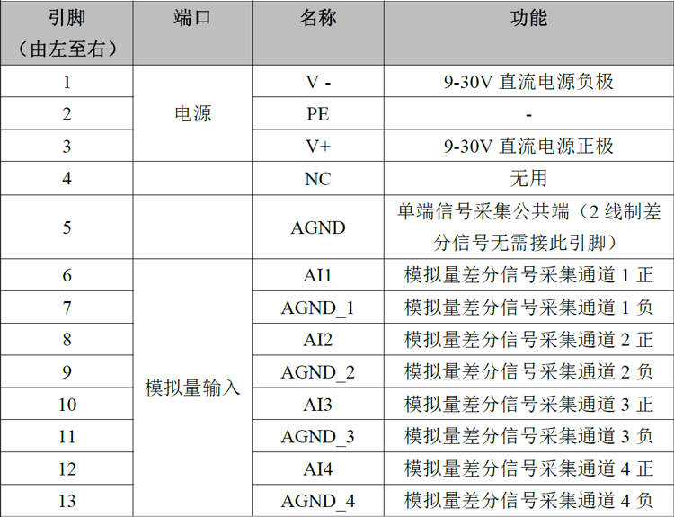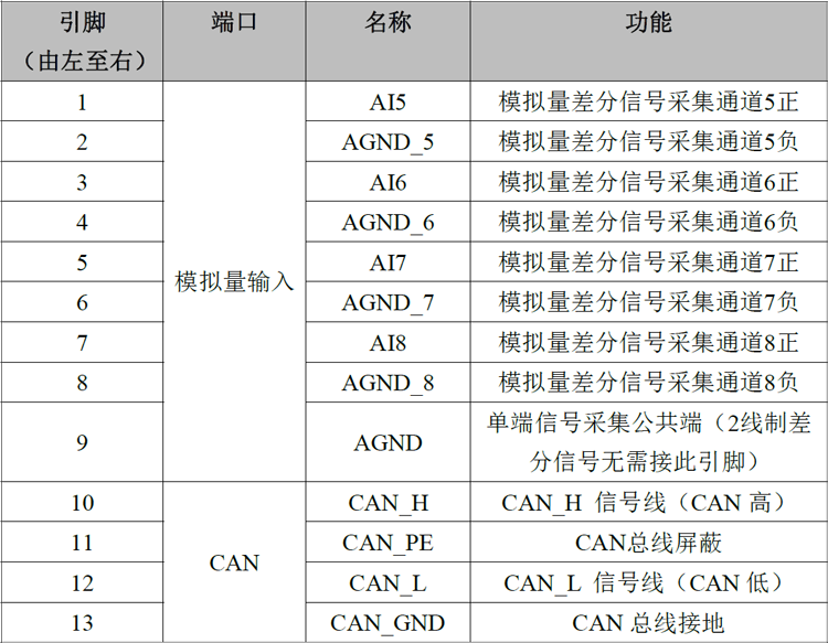 表2.2 CAN-bus接口、4路模拟量输入接口定义