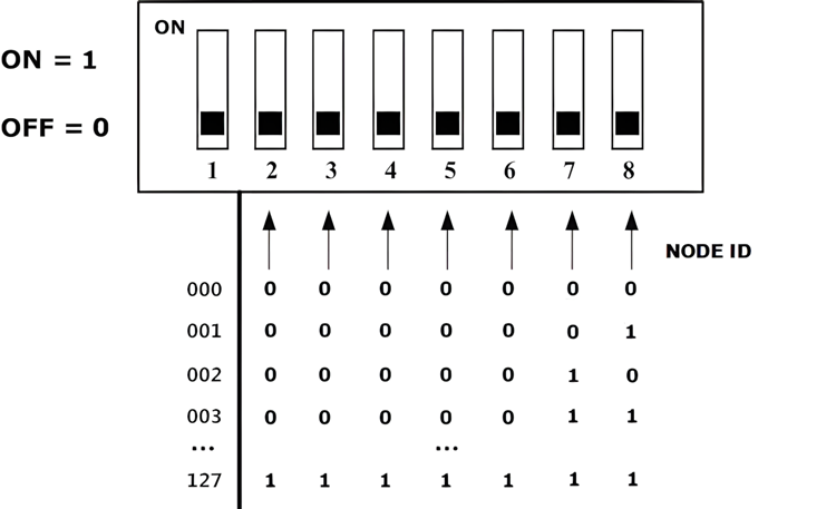 如图4.1所示,拨码开关的每个位拨向“ON“位置时,该位为“1”,如果拨向“OFF”位置,则该位为“0”。拨码开关的2-8位用于设定模块的节点号(NODE ID),第八位为最低位,第二位为最高位,模块的节点号(NODE ID)是各个二进制位对应的十进制数值之和,通过拨码开关设定模块的节点号(NODEID)的有效范围为0~127。