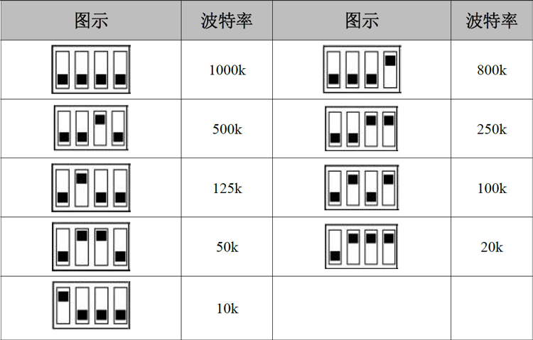 ● CAN-bus 通讯波特率支持8 种标准通信波特率;