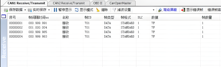 例如:通过拨码开关设置GCAN-4038的Node ID为1(以下节点号均为1),则USBCAN-II Pro作为主站设备可接收到一条节点状态数据,帧ID为0x701,帧数据为0x7F。如图5.1所示,使用ECANTools软件可以收到这条数据。