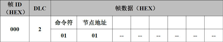 GCAN-4038模块接收由主站发出的操作指令,帧ID为0x000,DLC为2,帧数据第一个字节为命令符,第二个字节为节点号(若为00则控制全部节点)。