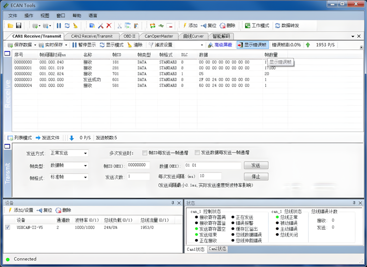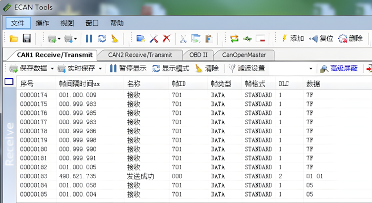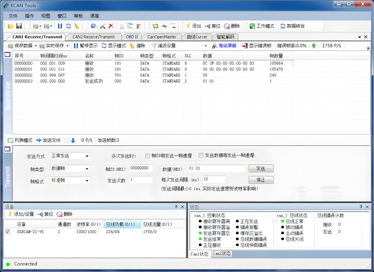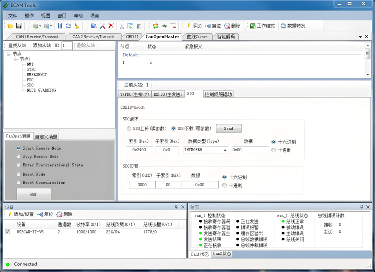 本章将使用广成科技USBCAN-II Pro模块及ECANTools软件可以进行CAN总线数据的接收与发送。软件附带的CANopen主站功能可以帮助调试CANopen从站,非常的方便实用。