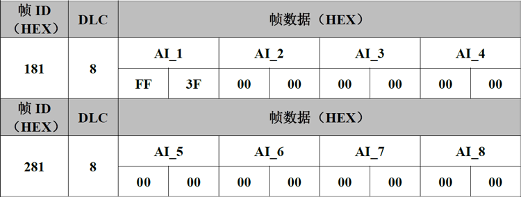 例如,GCAN-4038模块节点号设为1。若目前端口形式为默认的-10V~+10V,若通道1输入的电压为5V,则对应数字量为16383,转换为16进制是3FFF,又因为数据传输中低位在前高位在后,所以数据为FF 3F。若其余通道均无输入,则TPDO1命令的帧ID为0x181,数据长度(DLC)为8,帧数据为FF 3F 00 00 00 00 00 00。TPDO2命令的帧ID为0x281,数据长度(DLC)为8,帧数据为00 00 00 00 00 00 00 00。