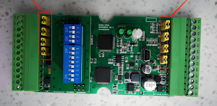 需要注意的是,-10V~+10V和-5V~+5V模式不需要接短接帽;-20mA~+20mA模式,需要将电路板的短接帽接上。如图5.8所示。也可在购买时联系客服提前确定模拟量采集的形式,我们会发货前帮您接好。(注:修改完之后重新上电生效。)