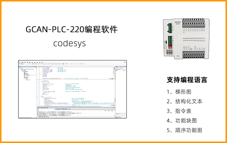 GCAN-PLC-220产品将微处理器、集成电源、输入电路和输出电路组合到一个结构紧凑的外壳中,形成功能强大的PLC。下载用户程序后,PLC将包含监控应用中的输入和输出设备所需的逻辑。GCAN-PLC-220可使用OpenPCS软件对其编程,也可使用CodeSys V3.5SP16及以上版本软件对其编程。软件支持符合IEC-61131-3标准中规定的五种标准编程语言,这使得程序的可移植性和复用性很强,而且软件还具有多种调试功能(断点、单步等),调试程序更加方便。