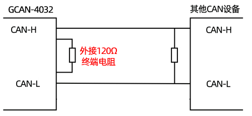 请注意:GCAN-4032模块内部未集成120Ω终端电阻。如果节点数目大于2,中间节点不需要安装120Ω的终端电阻。需要使用时,将电阻两端分别接入CAN_H、CAN_L即可,如图3.2所示。