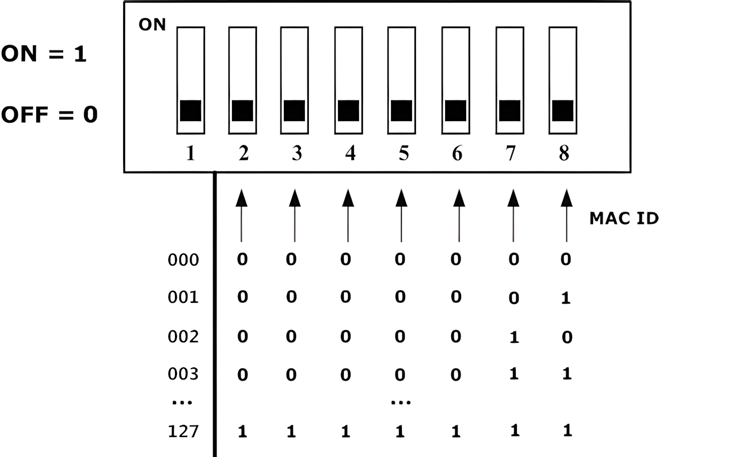 如图4.1所示,拨码开关的每个位拨向“ON“位置时,该位为“1”,如果拨向“OFF”位置,则该位为“0”。拨码开关的2-8位用于设定模块的节点号(MAC ID),第八位为最低位,第二位为最高位,模块的节点号(MAC ID)是各位对应的十进制值之和,通过拨码开关设定模块的节点号(MAC ID)的有效范围为0~127。