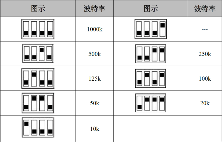 右侧拨码开关的1-4位用于设定模块的波特率,第一位为低位,第四位为高位。波特率与开关设置对应值如下表4.1所示。
