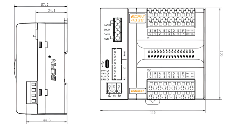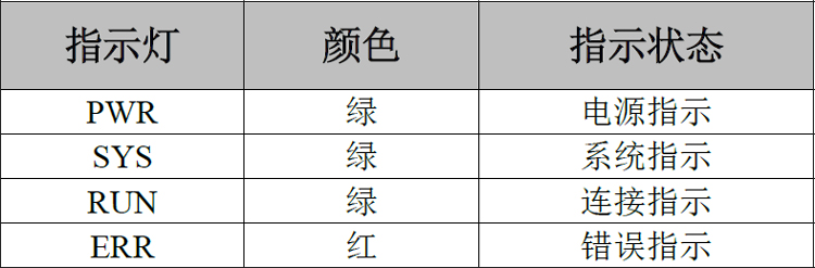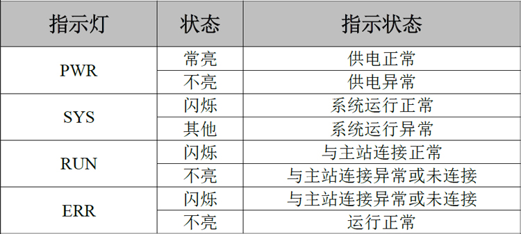 GCAN-4032 CANopen远程IO模块有两组指示灯,分别为系统状态指示灯和IO指示灯。系统状态指示灯具有1个PWR指示灯、1个SYS指示灯、1个RUN指示灯、1个ERR灯来指示设备的运行状态。