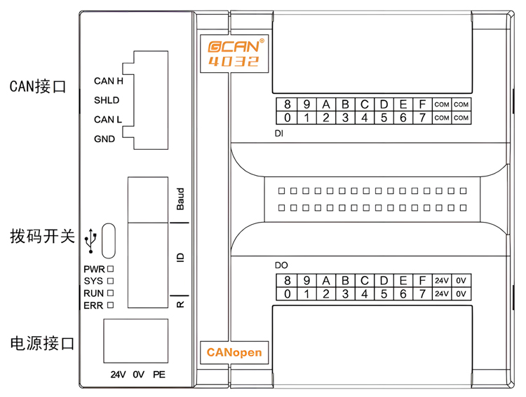 GCAN-4032模块集成1个CANopen通信接口,一个USB-Type C接口,1个电源接口,2组I/O电源接口(电源内部已短接),4个DI的COM接口。GCAN-4032模块的CANopen通信接口、电源接口位置如图2.4所示,接口定义如表2.2所示。