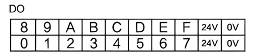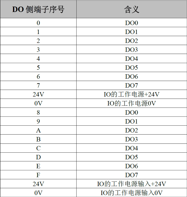 GCAN-4032的主控模块含有上下四排端子排,下方两排端子排为DO端子排,分别为DO0~DO7,DO8~DOF共16个数字量输出点,其中以及2组IO工作电源接口(IO工作电源已与系统电源隔离,电源内部已短接,IO模块需任选1组电源供电后才能正常工作),如图所示。各个端子对应的序号及其含义如表2.3所示。