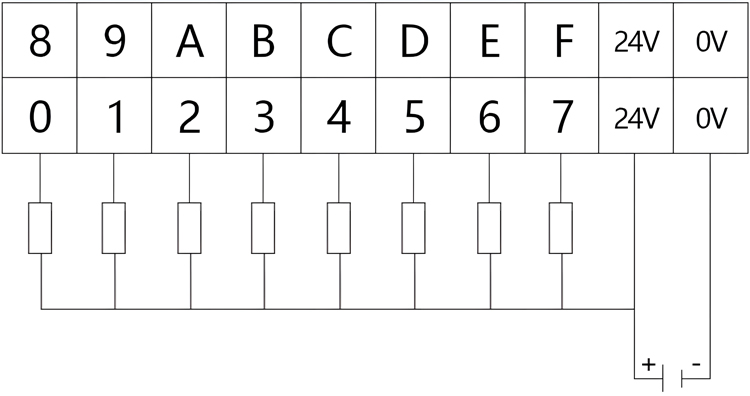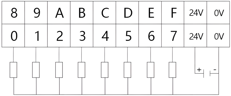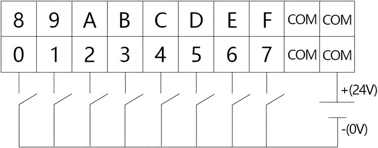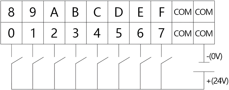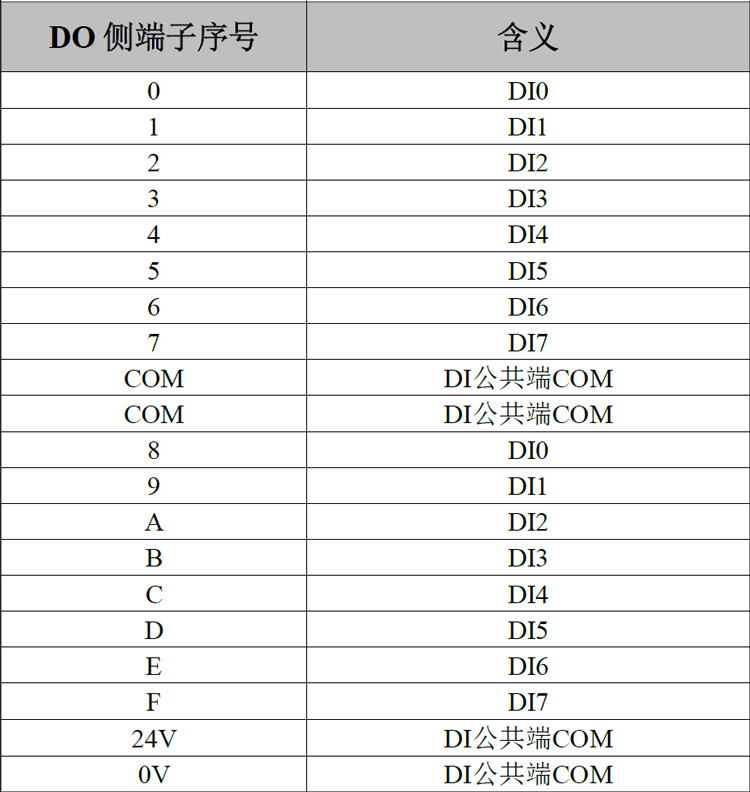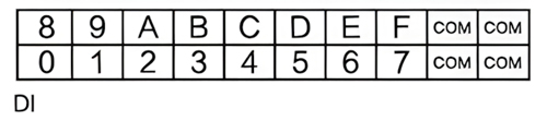 上方两排端子为DI端子排,分别为DI0~DI7,DI8~DIF共16个数字量输入点,以及4个DI的COM接口(4个COM口任意连接1个即可),如图所示。