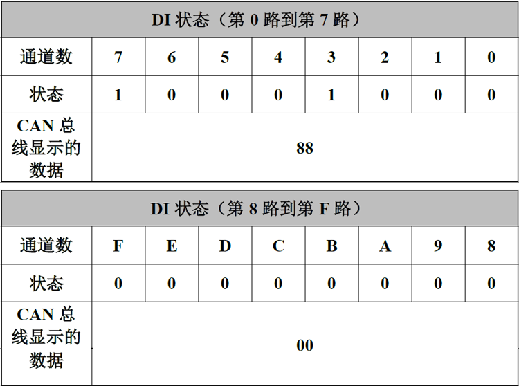 数字量输入的状态由两个字节来表示,第0到7路由第一个字节表示;第8到F路由第二个字节表示。举例:第一个字节里通道8在高位,通道1在低位。