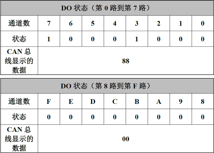 数字量输出的状态由两个字节来表示,第0到7路由第一个字节表示;第8到F路由第二个字节表示。举例:第一个字节里通道8在高位,通道1在低位。