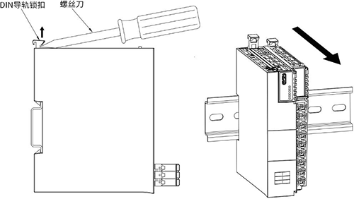 如图所示,使用一字螺丝刀或类似工具向上撬动导轨锁扣,在凸起部位将模块向外拉出,将模块取出。