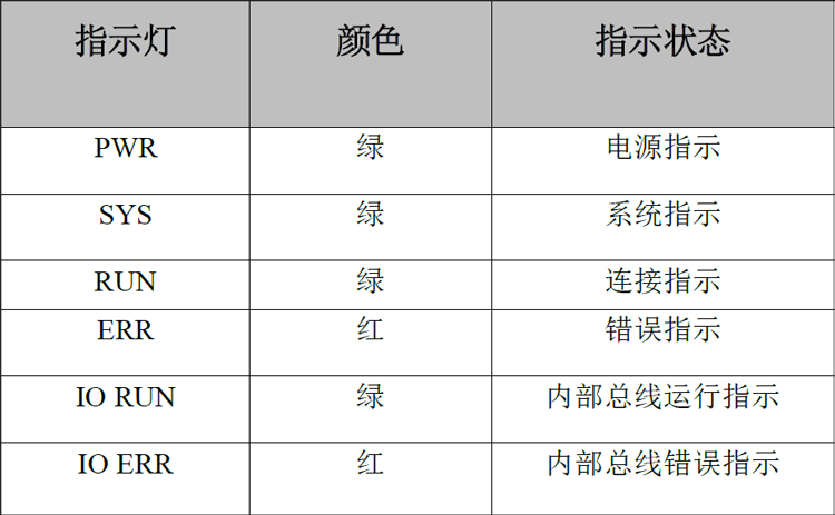 表2.1 GCAN-IO-8101总线耦合器模块指示灯