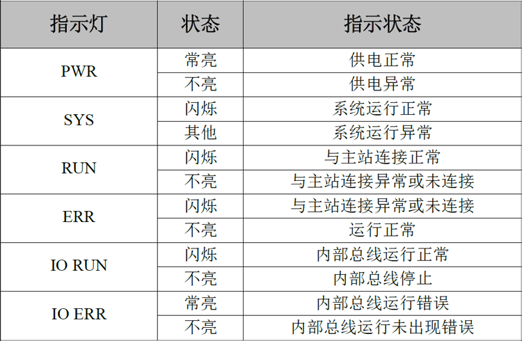表2.2 GCAN-IO-8101总线耦合器模块指示灯状态
