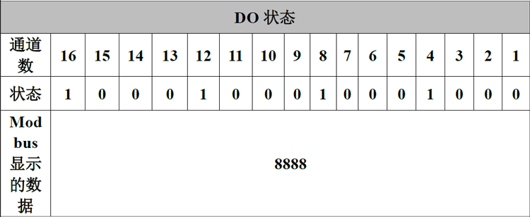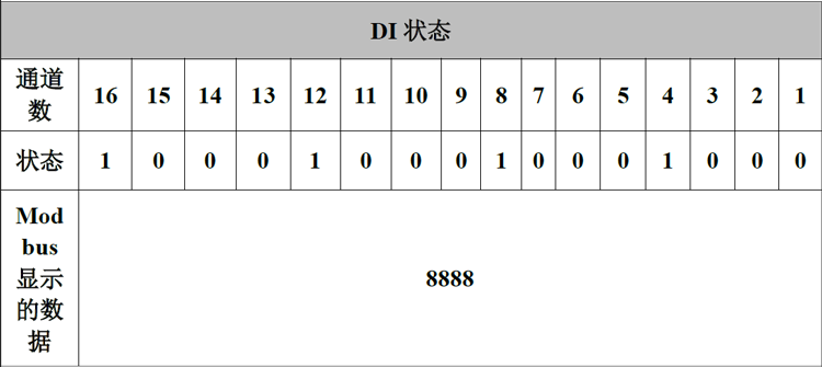 数字量输入的状态由一个字节来表示,通道8在高位,通道1在低位。例如,GCAN-8101模块节点号设为1。通道1通道4通道8通道12通道16状态为1,其他状态均为0,则Modbus一端显示的DI状态数据为8888。下表列举了两种常见的DI状态及其对应的状态数据。