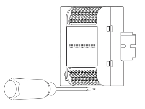 先将模块下方的导轨卡扣用一字螺丝刀拉出;然后将模块挂到DIN导轨上,并使用一字螺丝刀将下方的导轨卡扣推进去锁定,如图所示: