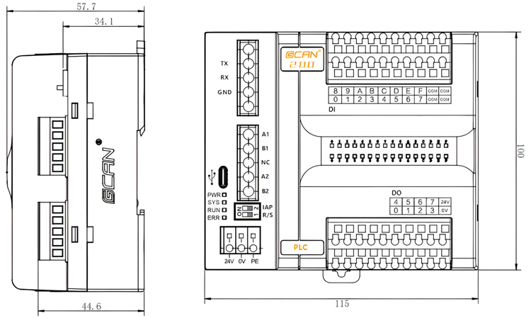 GCAN-PLC-200外观如图2.1所示,(长)115mm*(宽)100mm*(高)58mm。