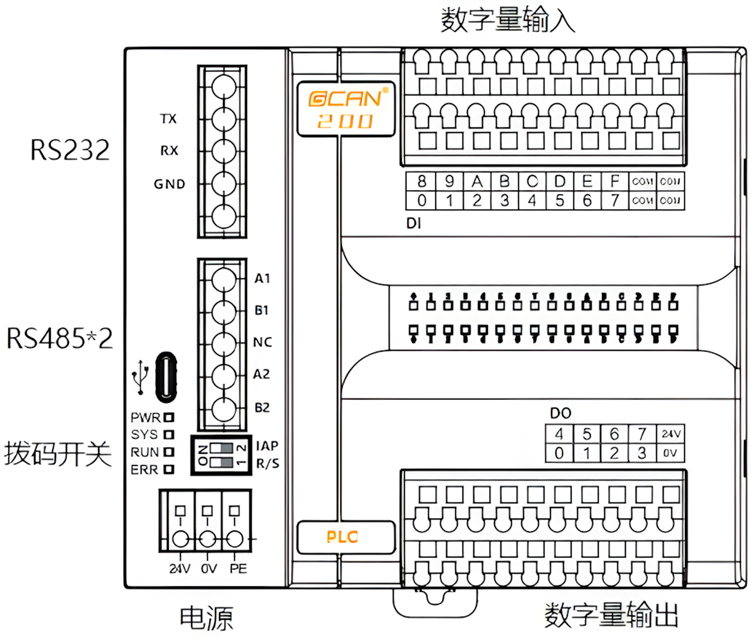 图2.4 GCAN-PLC-200各接口位置(12路DI)