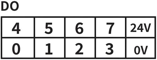 GCAN-PLC-200的主控模块右侧顶板含有上下四排端子排,下方两排端子排的右侧为DO端子排,分别为DO0~DO7共8个数字量输出点,以及1组IO供电电源接口(IO供电电源已与系统电源隔离,IO模块需供电后才能正常工作),如图所示。各个端子对应的序号及其含义如表2.4所示。