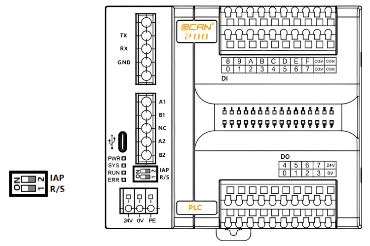 GCAN-PLC-200提供1个程序运行开关和1个复位按键。如图4.1所示: