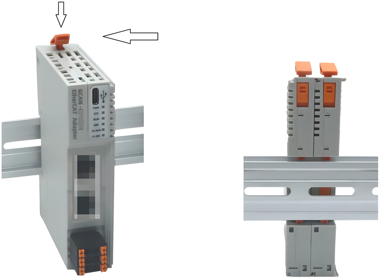 GCAN-PLC-325可编程逻辑控制器的锁定和解锁状态如图2.2所示。当模块未安装在导轨上时,请将导轨锁扣保持在锁定状态,如长时间处于解锁状态,可能会导致锁扣失效。
