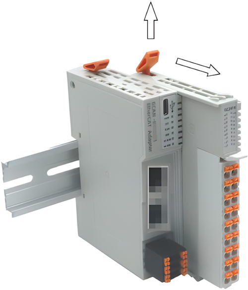 GCAN-PLC-325可编程逻辑控制器最多可以连接32个扩展IO模块。插入扩展IO模块时,一定要沿着凹槽,在已有模块的右侧顺次插入,再按下锁扣并并发出“咔”的一声。在整个节点的最右端,您需要安装终端端子模块,请注意终端模块安装方向。该终端可以保障GC-Bus的数据传输与电力供应。