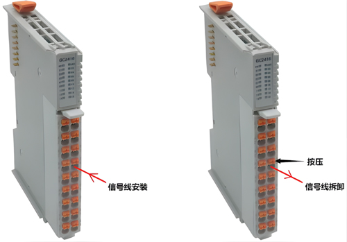 使用一字端子接头的线缆,将端子接头对准相应通道的圆孔插入即可;拆线时,需使用一字螺丝刀,插入需拆线的通道旁对应橘黄色方形孔,用力向下按压,此时相应圆孔中的夹片会松动,线缆即可轻松拔出。