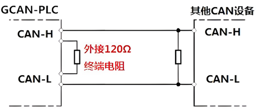 请注意:GCAN-PLC-325的CAN总线内部未集成120Ω终端电阻。如果节点数目大于2,中间节点不需要安装120Ω的终端电阻。需要使用时,将电阻两端分别接入CAN_H、CAN_L即可,如图3.2所示。
