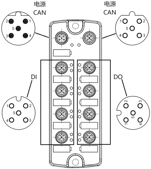 GCAN-6057模块集成1路CAN总线(2个CAN接口),2组电源接口(电源内部已短接,只需接1组即可),8组DI接口,8组DO接口。GCAN-6057模块的接口位置如图2.2所示,接口定义如表所示。