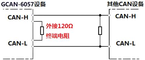 请注意:GCAN-6057模块内部未集成120Ω终端电阻。如果节点数目大于2,中间节点不需要安装120Ω的终端电阻。需要使用时,将电阻两端分别接入CAN_H、CAN_L即可,如图3.2所示。