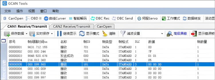 接收到NMT指令之后,GCAN-6057将开始广播PDO数据,并发出帧ID为0x701,帧数据为0x05的心跳指令,说明GCAN-6057已进入操作状态,自动接收输入DI状态,帧ID为0x180+节点号(Node ID),数据长度(DLC)为3。