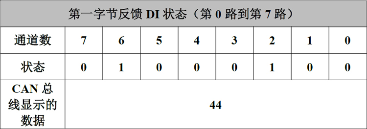 例如,GCAN-6057模块节点号设为1。输入通道6和输入通道2状态为1,其他状态均为0。则反馈的帧ID为0x181,数据长度(DLC)为3,第1个字节,反馈DI状态的帧数据为0x44。